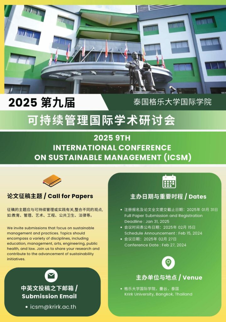 The 9th International Conference on Sustainable Management will bring together scholars, industry experts, and researchers from around the world to highlight and celebrate international academic achievements in Southeast Asia. The conference aims to integrate sustainable development principles across various management practices, encompassing diverse disciplines such as education, management, arts, engineering, public health, and law. By fostering interdisciplinary collaboration, the event seeks to advance sustainable management strategies and promote innovative solutions to contemporary challenges. Ultimately, the conference strives to enhance the understanding and implementation of sustainable practices within different sectors, contributing to the overall sustainability goals in the region and beyond.