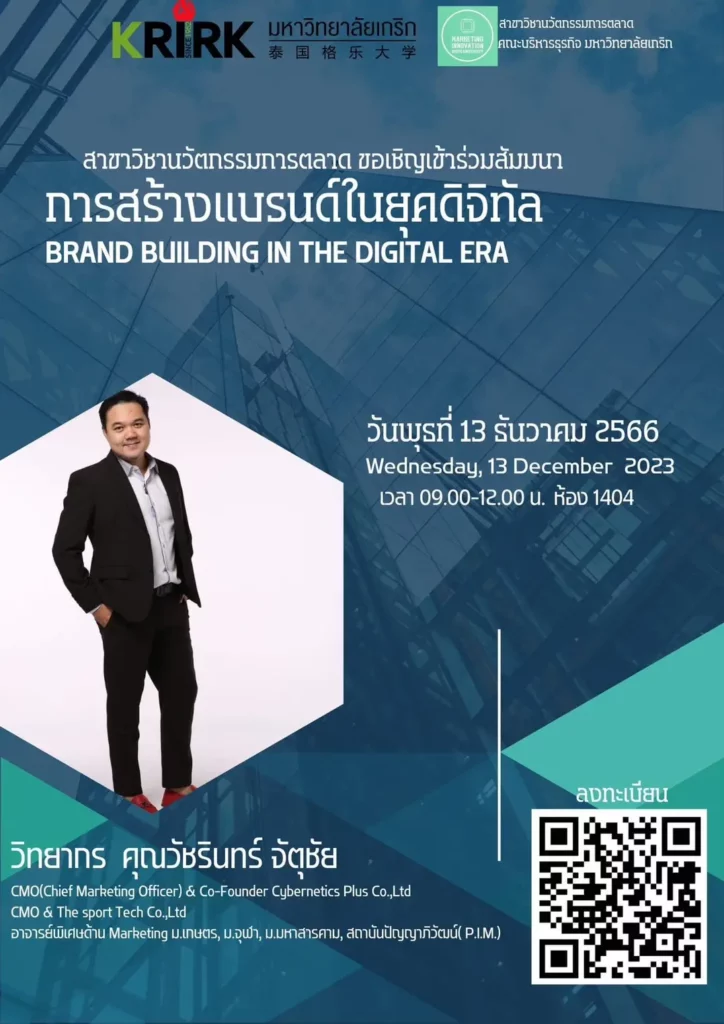 The Marketing Innovation Program at the Faculty of Business Administration, Krirk University, invites all interested faculties to participate in the seminar “Brand Building in the Digital Era.” This event will be packed with knowledge on branding management, including topics such as Customer Persona Analysis, Brand Identity Development, Brand Meaning Interpretation, Brand Response, and Brand Relationship.